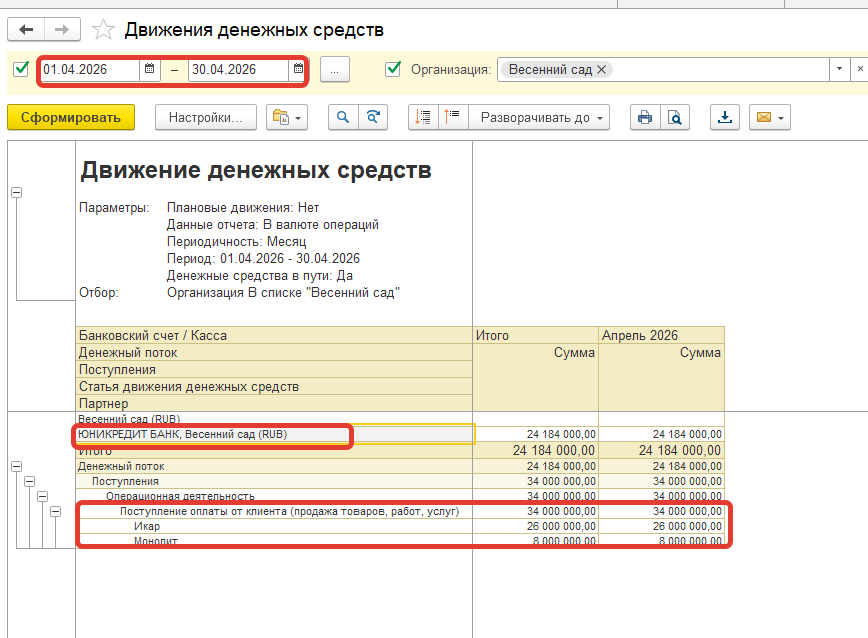 В настройках отчета необходимо выбрать расчетный счет/счета , по которому нужно увидеть поступления от покупателей, период формирования (обычно текущий месяц). Если есть статья движения денежных средств, для поступлений от покупателей учитываемых при расчете ЧКО, можно делать отбор по этой статье ДДС.